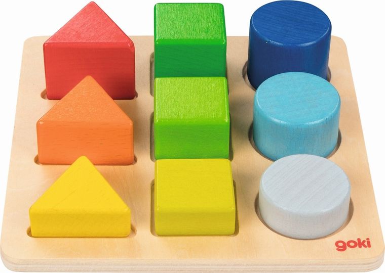 - Układanka z klockami Komplet kształtów marki Goki to doskonała rozrywka dla najmłodszych wspierająca rozwój spostrzegawczości oraz małej motoryki.